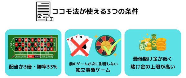ココモ法は、配当が3倍のゲームで使える攻略法です。