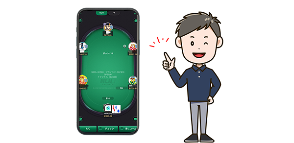 操作性はスマホアプリに最適化されているので、外でも本格的なテキサスホールデムを楽しめます。