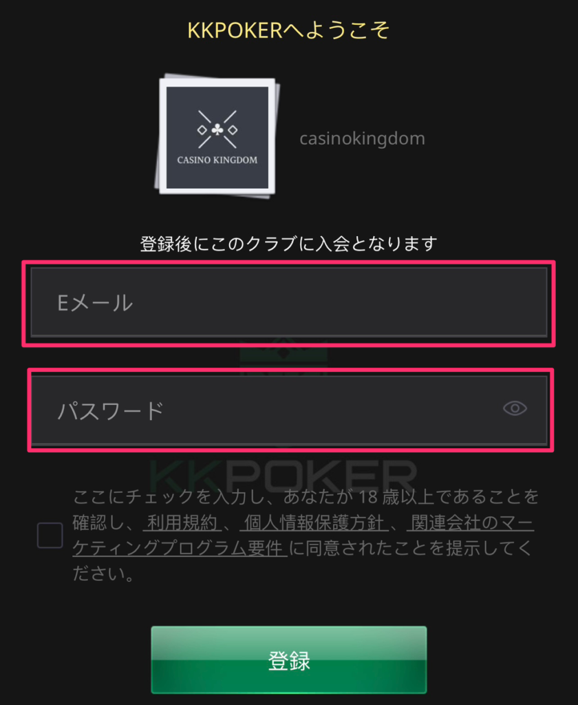 まずは「KKポーカーの登録ページ」へアクセスしましょう。ページへアクセスすると、当サイトで運営するKKポーカークラブ経由で登録できます。