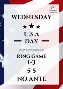 毎週水曜日に行われているUSA DAYイベントは、リングゲームのブラインドが1-3,5-5でNO ANTI (BBとは別に支払う参加料みたいなもの)に変化します。