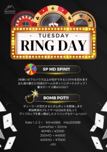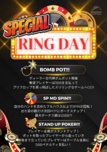 月一で開催されているSP RING DAYと違い、STAND UP GAMEは行われませんが、ポムポットが行われるので、ギャンブルが好きな人や、実際の海外のカジノに近い雰囲気でポーカーを行いたい人にはおすすめのイベントです。