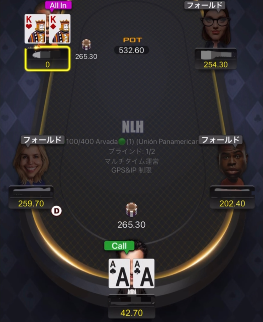 例えば、AAを持ってプリフロップで相手にオールインされました。全ポーカープレイヤーが歓喜する瞬間ですね。