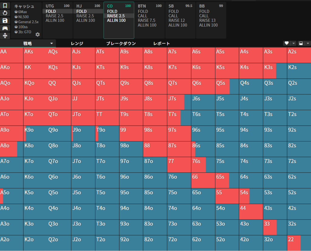 下の表はCOにおけるハンドレンジ表です。赤く塗られているハンドでオープンレイズをします。