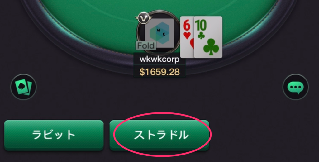 ブラインド以外のポジションの人がBBの2倍以上のチップを置いてブラインドベットするオプションのこと。ストラドルをした人のポジションはSTRと略されます。