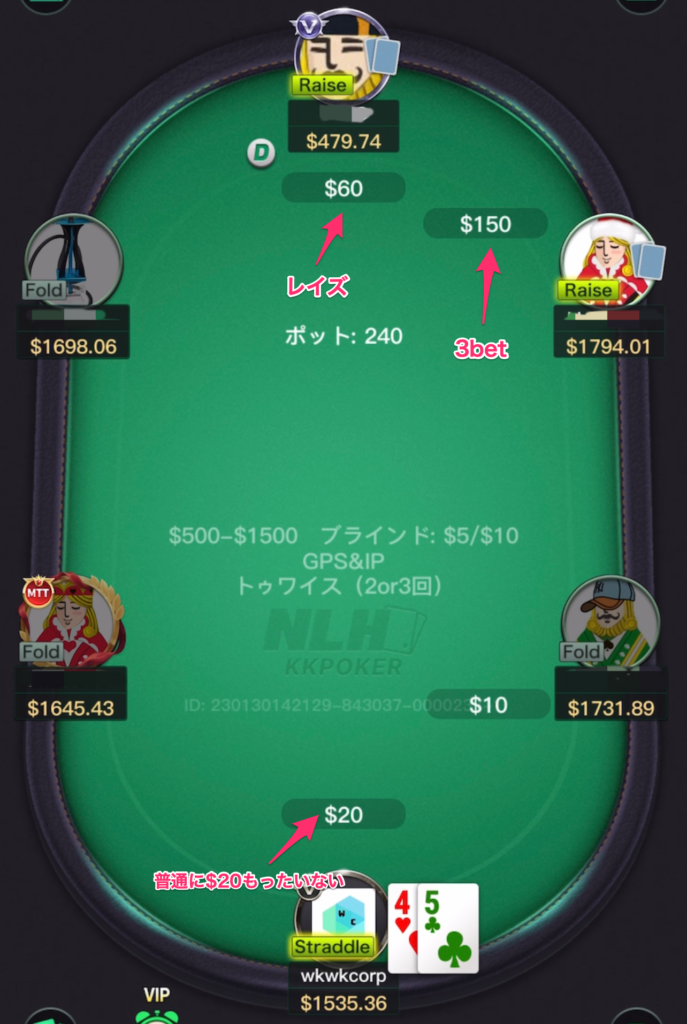 僕はメタ読み(この相手俺のストラドルずっと狙っている)もあり、3betを返しました。