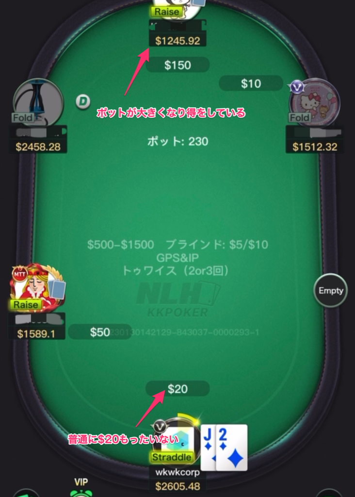 このように実質レートが上がり、ポットが動きやすくなることがストラドルの特徴であり、多くの人がストラドルする理由だと言えます。