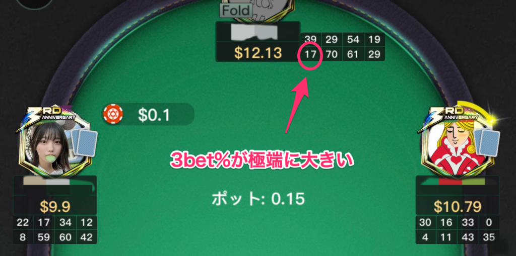 また、マイクロステークスのキャッシュゲームには3bet%が極端に大きい(15%~)プレイヤーもよく見られます。