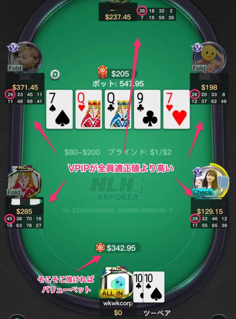 逆に、レーキの影響が大きいライブキャッシュなどのフィールドでは、VPIPを少し小さく保つといいでしょう。